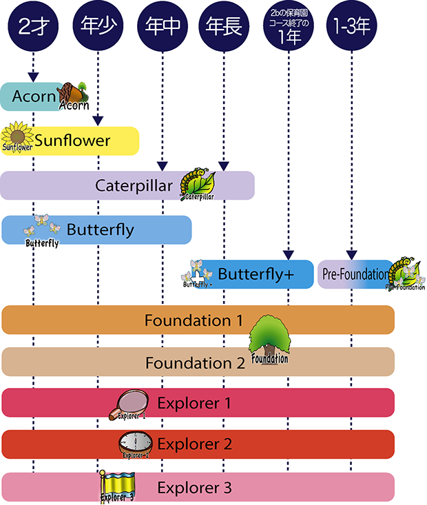 ・年長でCaterpillarコースを始めたお子様は、2年目にはButterflyではなくButterfly+(プラス)に進級します。